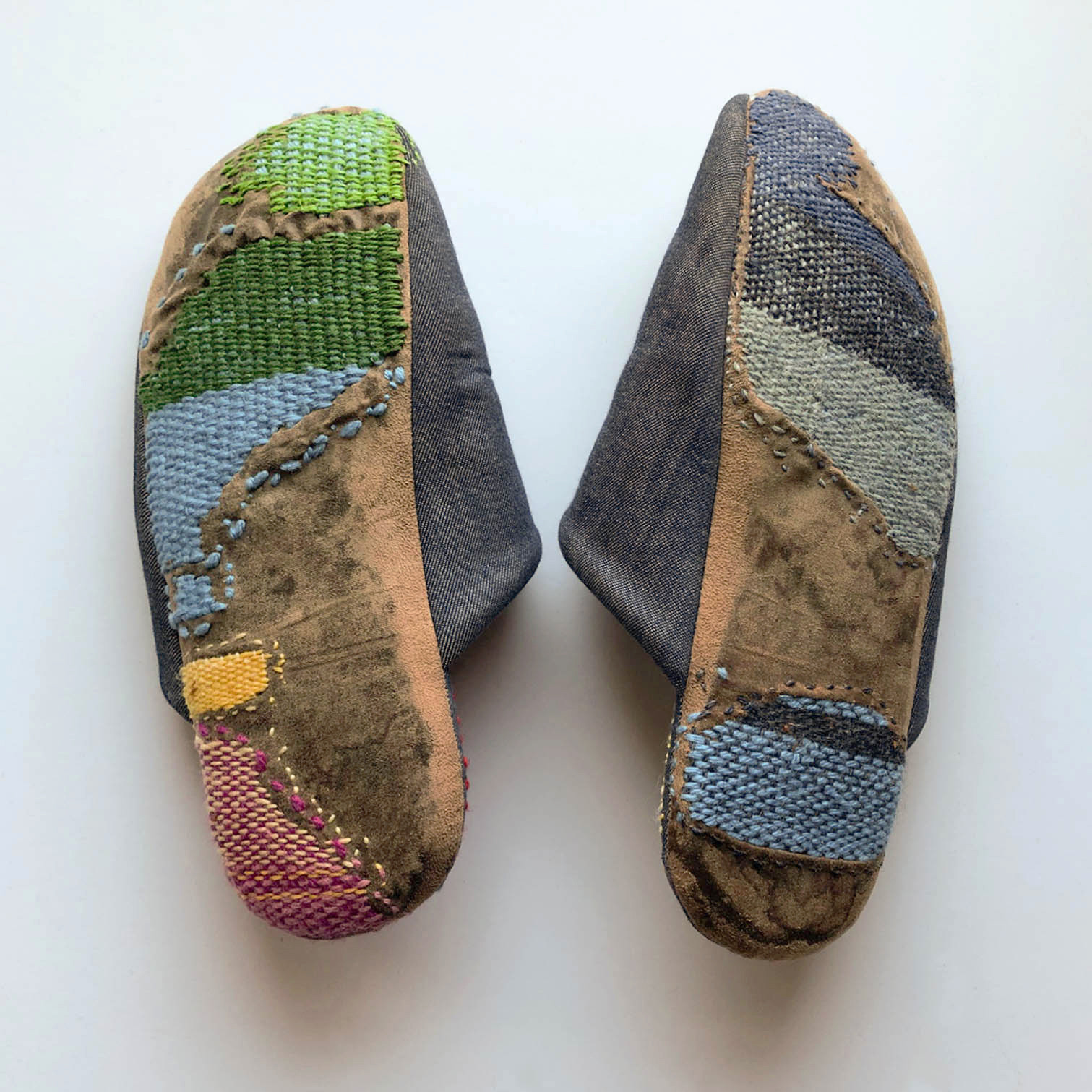 This pair of Denim Cushion Slippers was worn every day in the last year and half. The damage on them was from that everyday use. They have been mended with wool, linen and cotton yarns. Where they have been mended a second and third time the new darning has caught strands of wool from the original darns and woven them into the new mend.